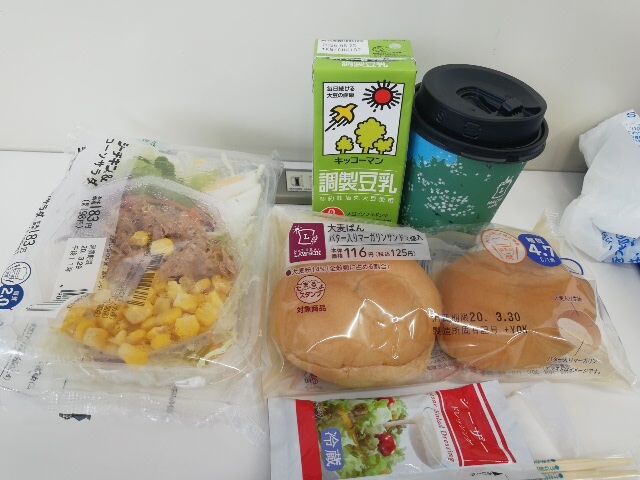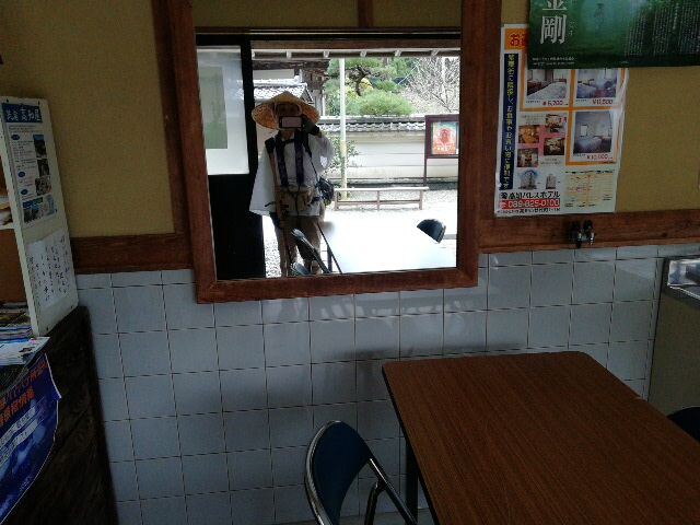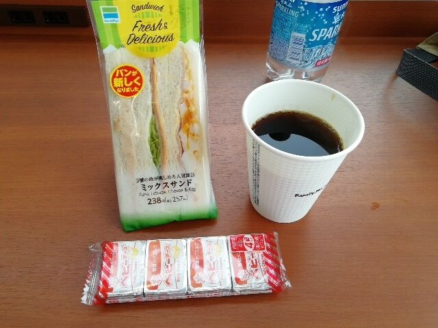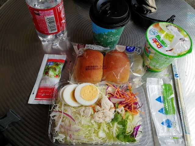 12:20 ファミマでお昼休憩。外にも広いテーブル席があるが、寒いので、中のイートインコーナーで食べた。