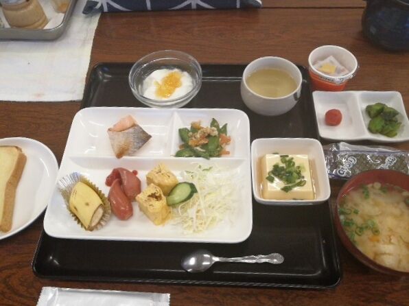 ヨーグルト、バナナ、納豆がうれしい。埼玉の女性と話しながらいただく。