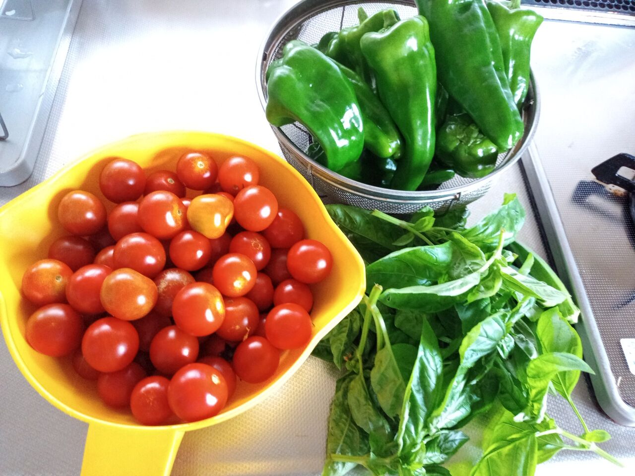 ミニトマト、ザル1杯、巨大ピーマン、ザル1杯とバジル。