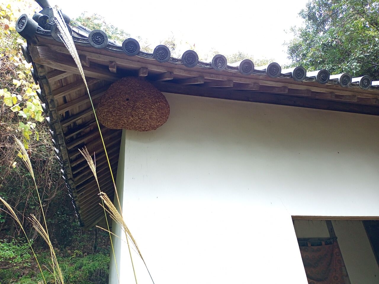 立派なスズメバチの巣があった。まだハチが出入りしていた。