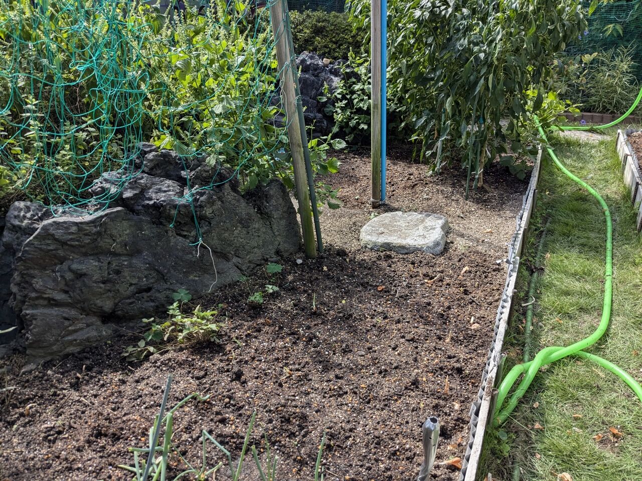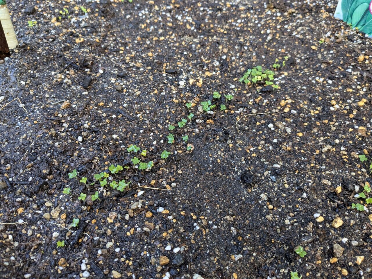 2024年09月27日 種蒔き 終わりかけのバジルが1本と、まだまだ元気なピーマンが残っている。はびこっていたしそを抜いて、種を蒔いた。ほんの少しずつ。 水菜、春菊、小松菜、チンゲンサイ、スナップエンドウ。100均の種。土がカラカラな上に雨も降らないので、水はまいたが、芽が出てくれるかどうか。春にとっておいたわけぎも植えた。分葱はネギ替わりになるし、とても重宝する。昔、父の畑にあったものを持って帰って毎年、植える。