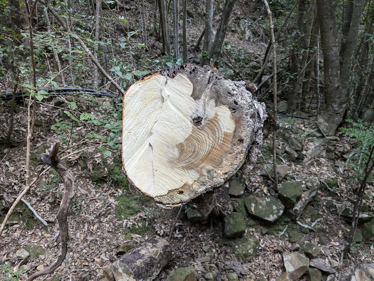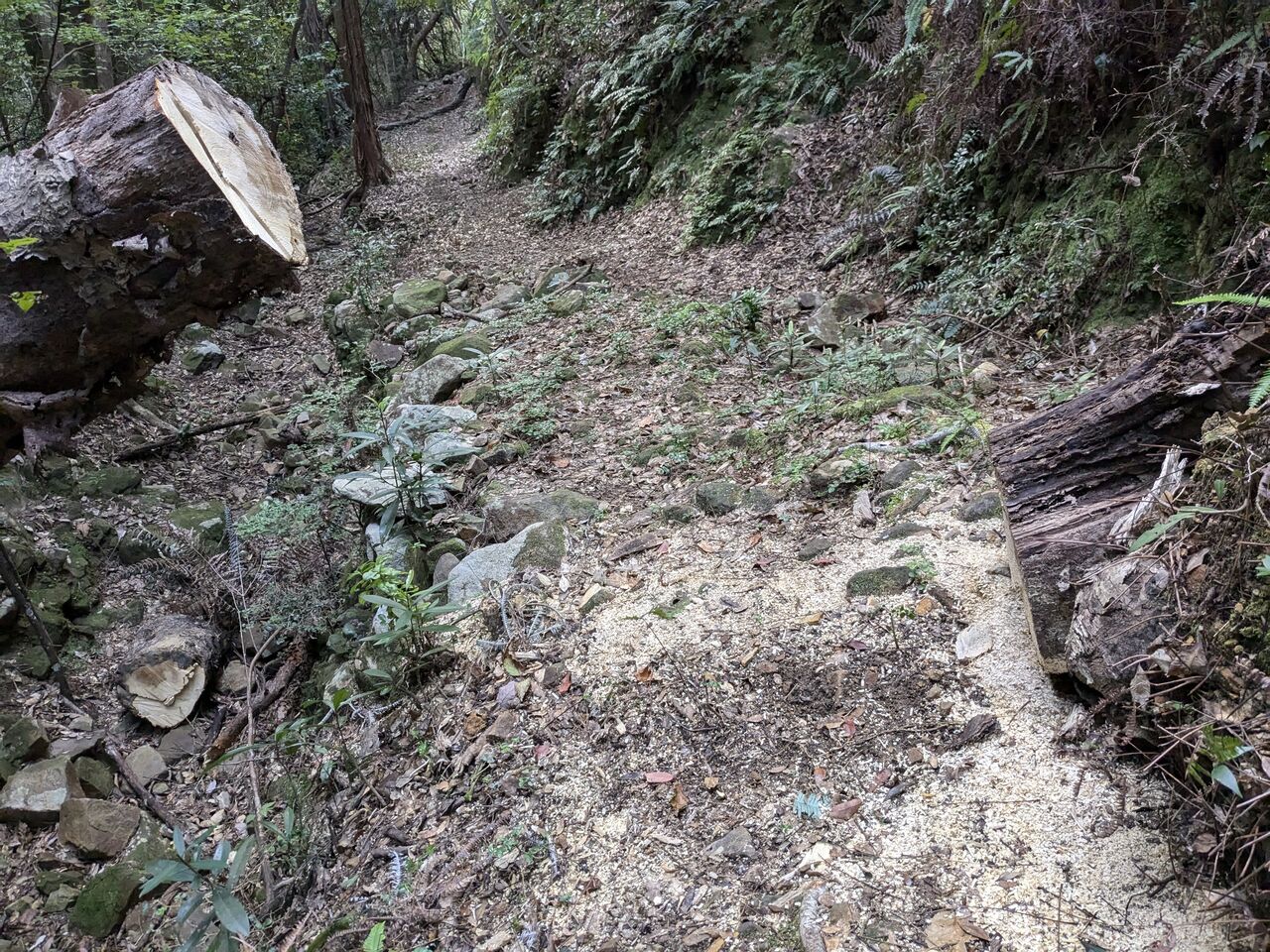 7:35 多分道を塞いでいたと思われる大きな丸太が、切り落とされていた。まだ、下におが屑が落ちている。