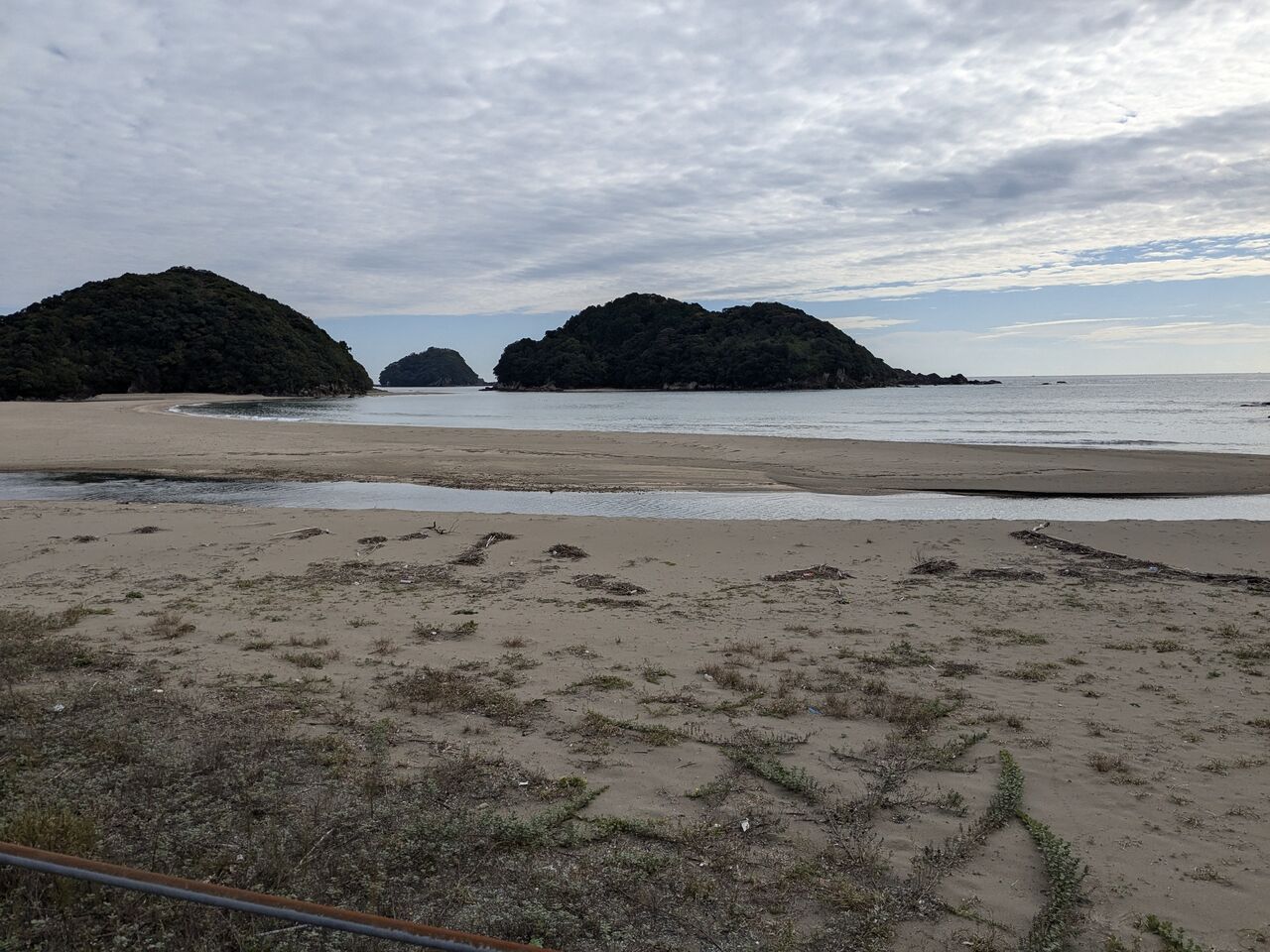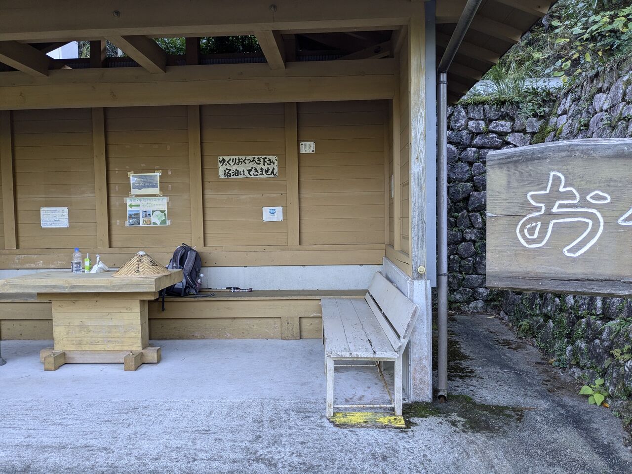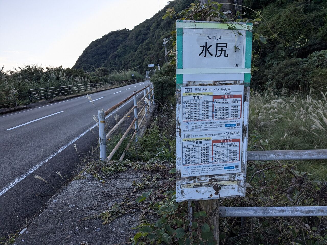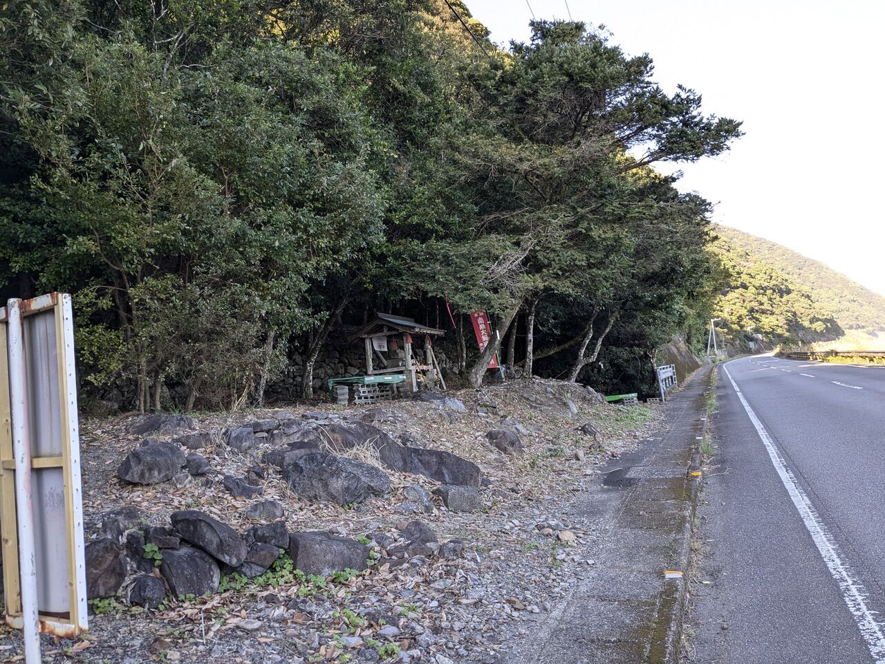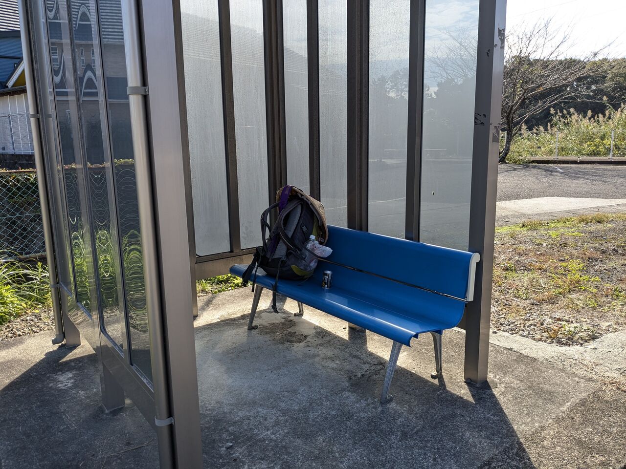 11:12 生見の屋根のあるバス停でお昼休憩。パン、豆乳、バナナ、みかん、缶コーヒー。ホッとしたのとバスに乗ると決めていたのもあって、ゆっくりした。1時間近くたっていた。