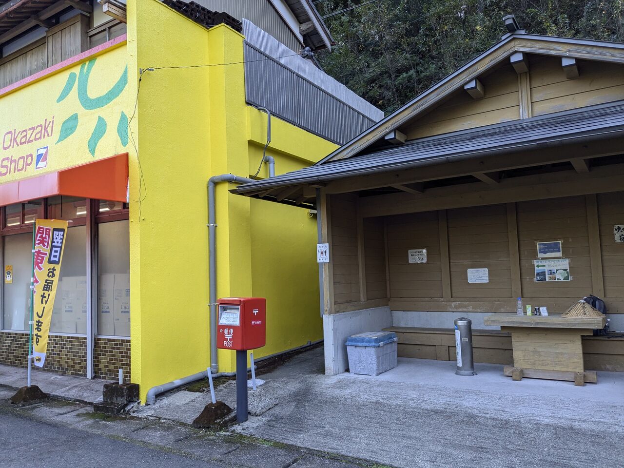 11:27 スーパー「岡崎商店」横の「お休みどころ」でお昼休憩。豆乳があれば買おうと、初めて中に入ってみた。パン、サンドイッチ、お結び、総菜、お酒、何でもある。横には自販機もトイレもある。