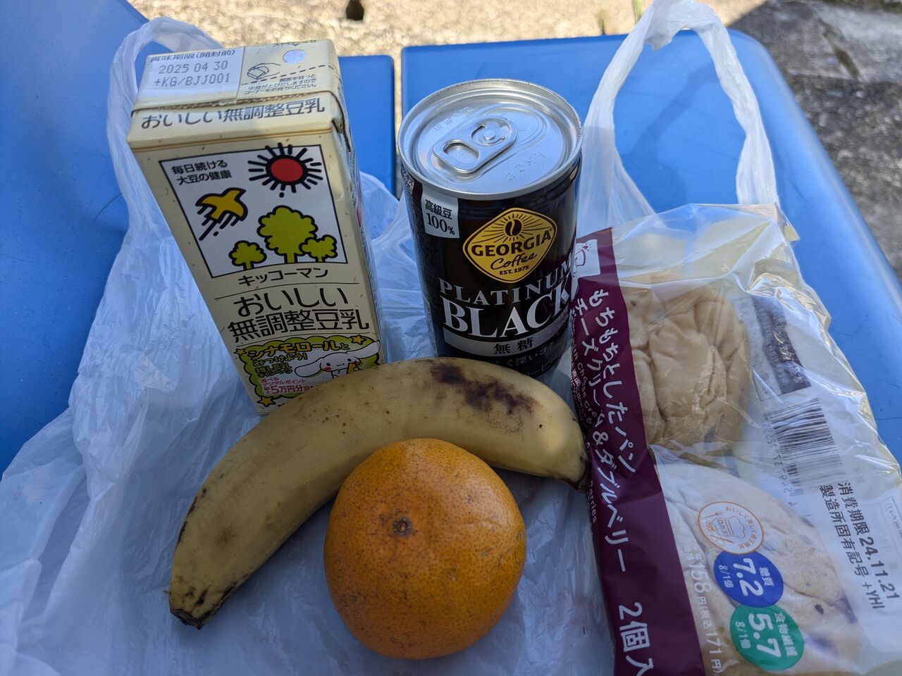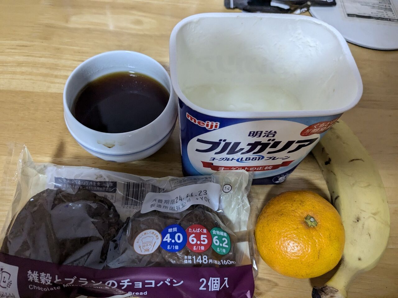 5:21 部屋で朝食。パン、バナナ、ヨーグルト、みかん、コーヒー。