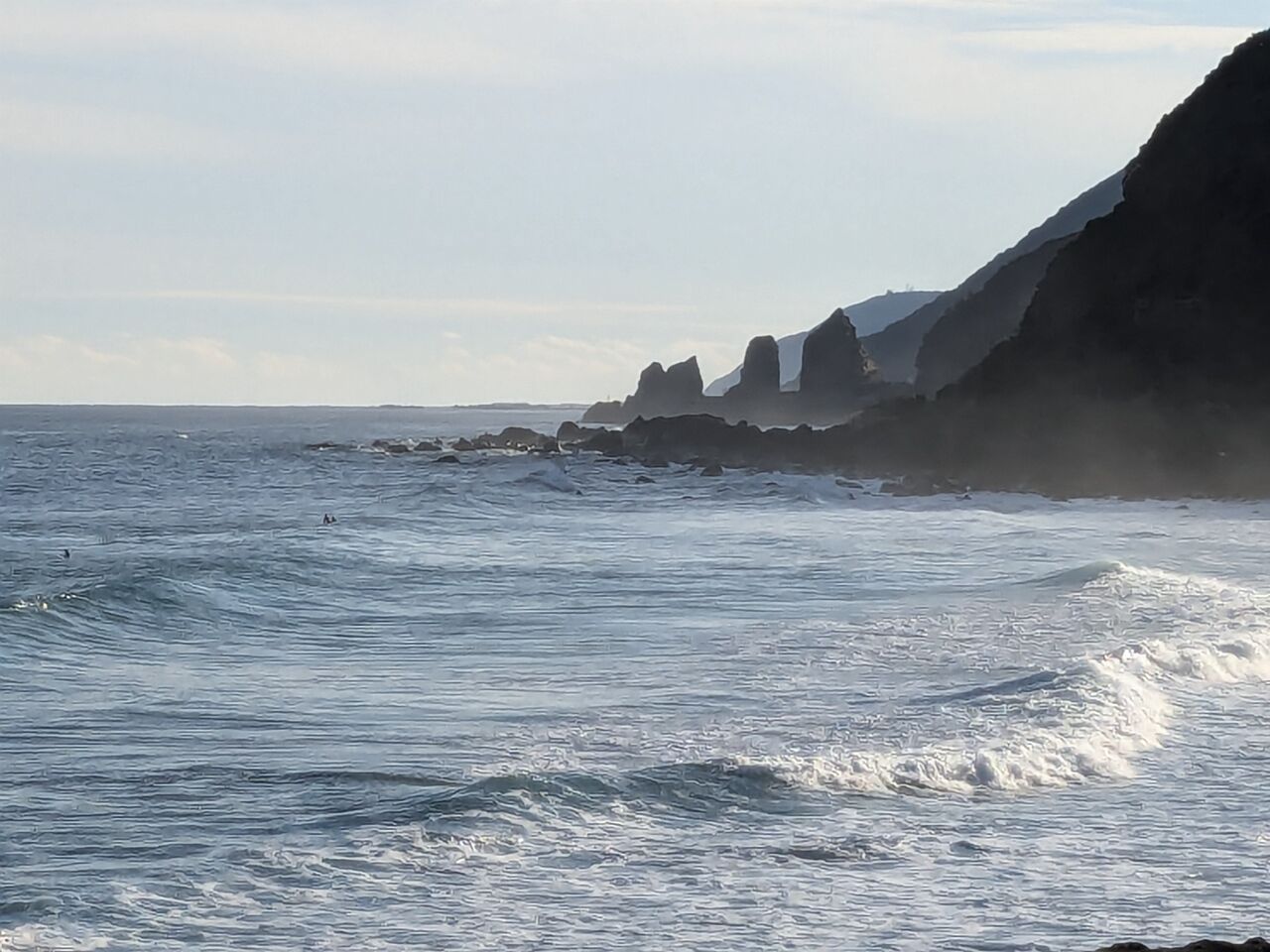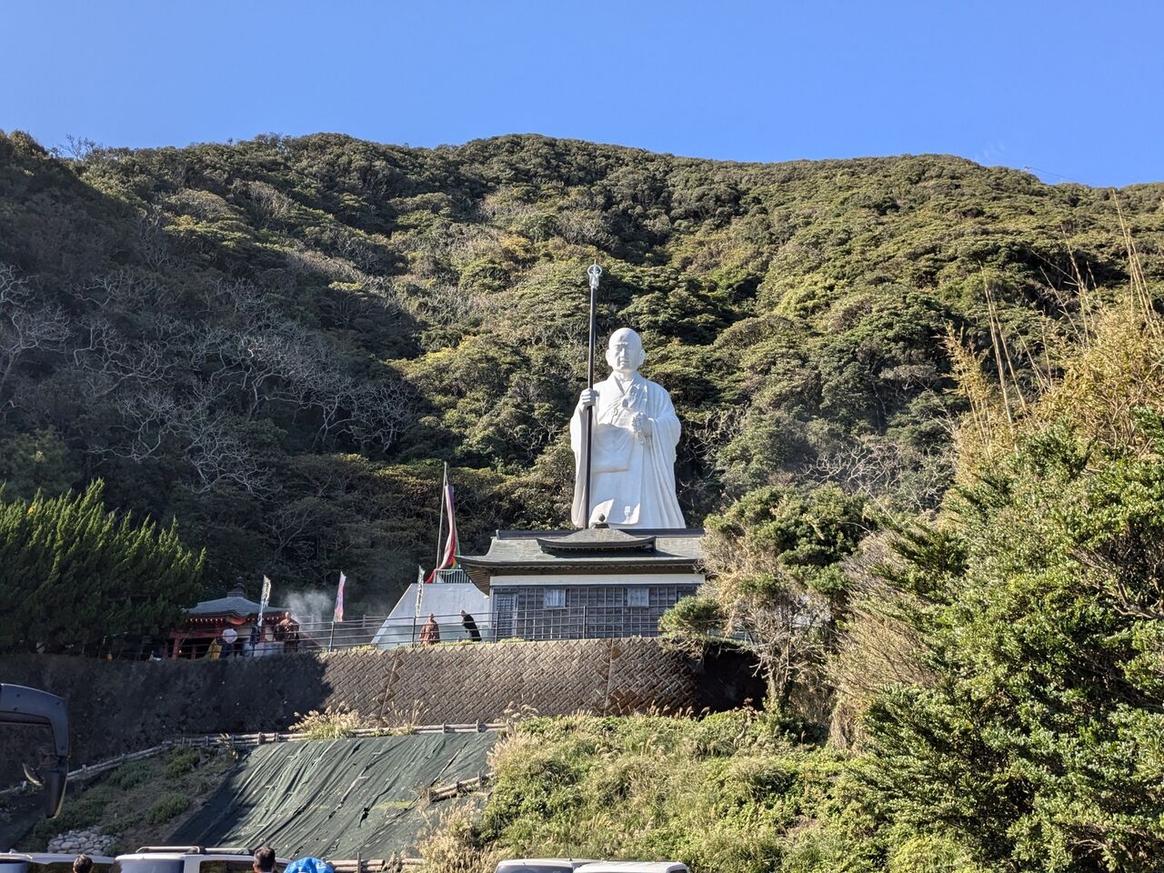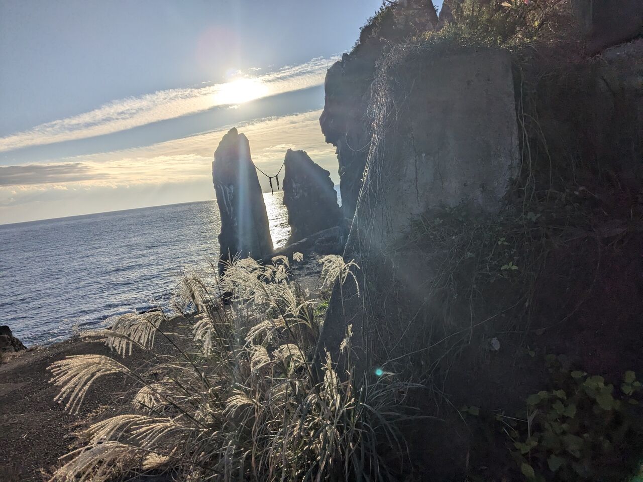 バスから降りて、向こうに夫婦岩が見える。