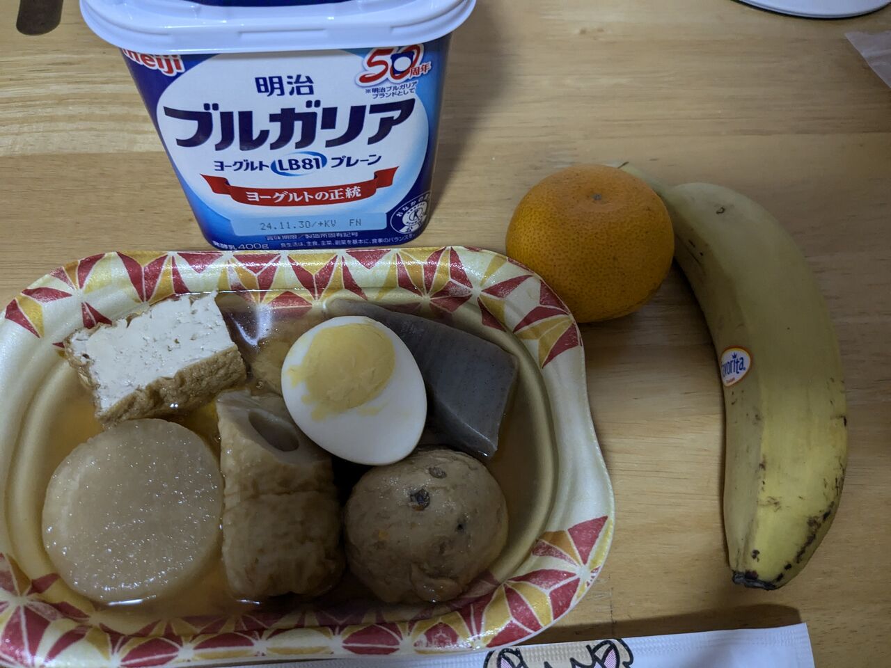 5:30 部屋で夕食。おでん、ヨーグルト、バナナ、ここでいただいたミカン、後でコーヒー。