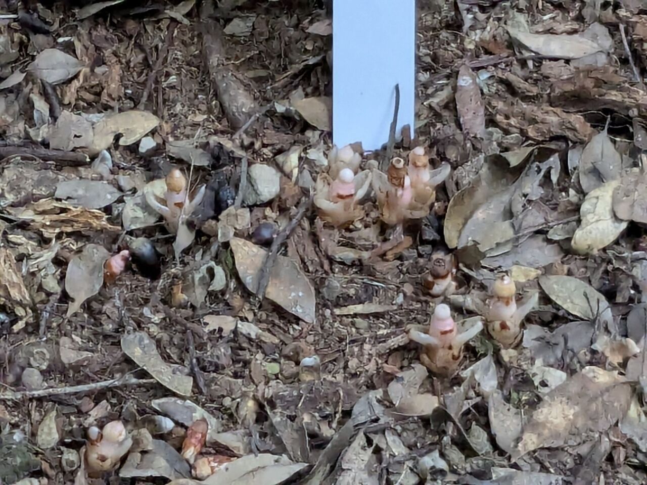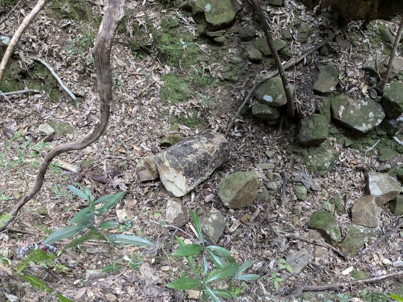 シダが大量に刈ってある。大きな松ぼっくりが落ちている。