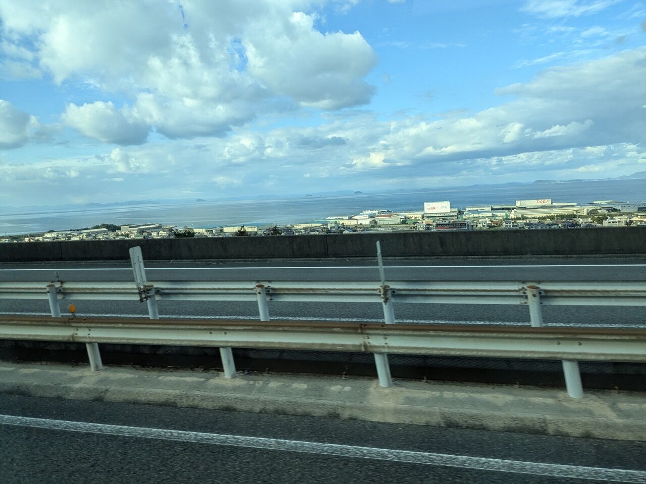 14:49 車窓から。町と海と島が見える。