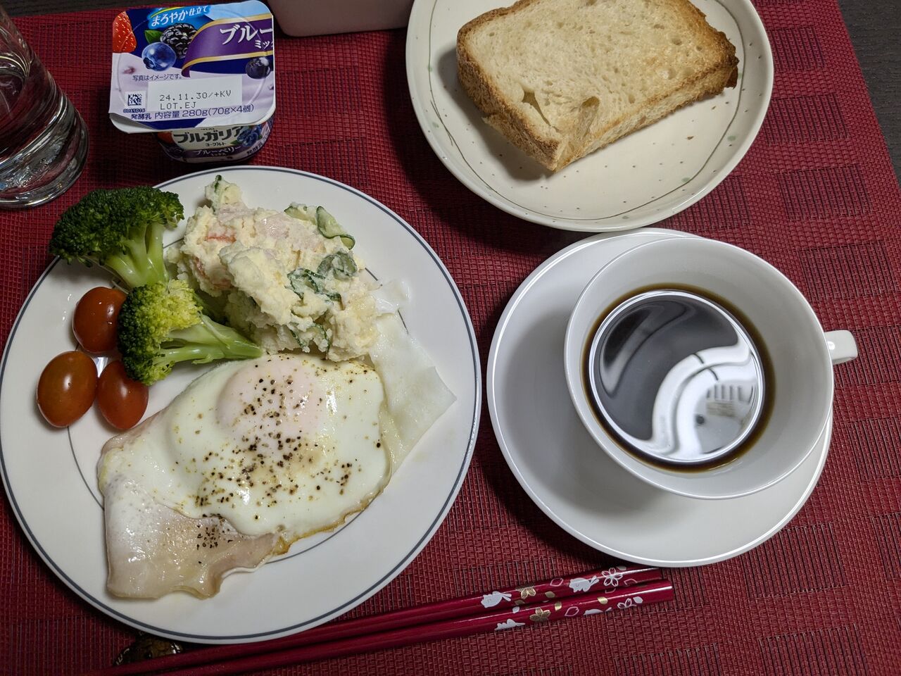 6:34 中に入って、朝食。新潟さんが、フリードリンクのドリップのコーヒーを淹れてくださった。