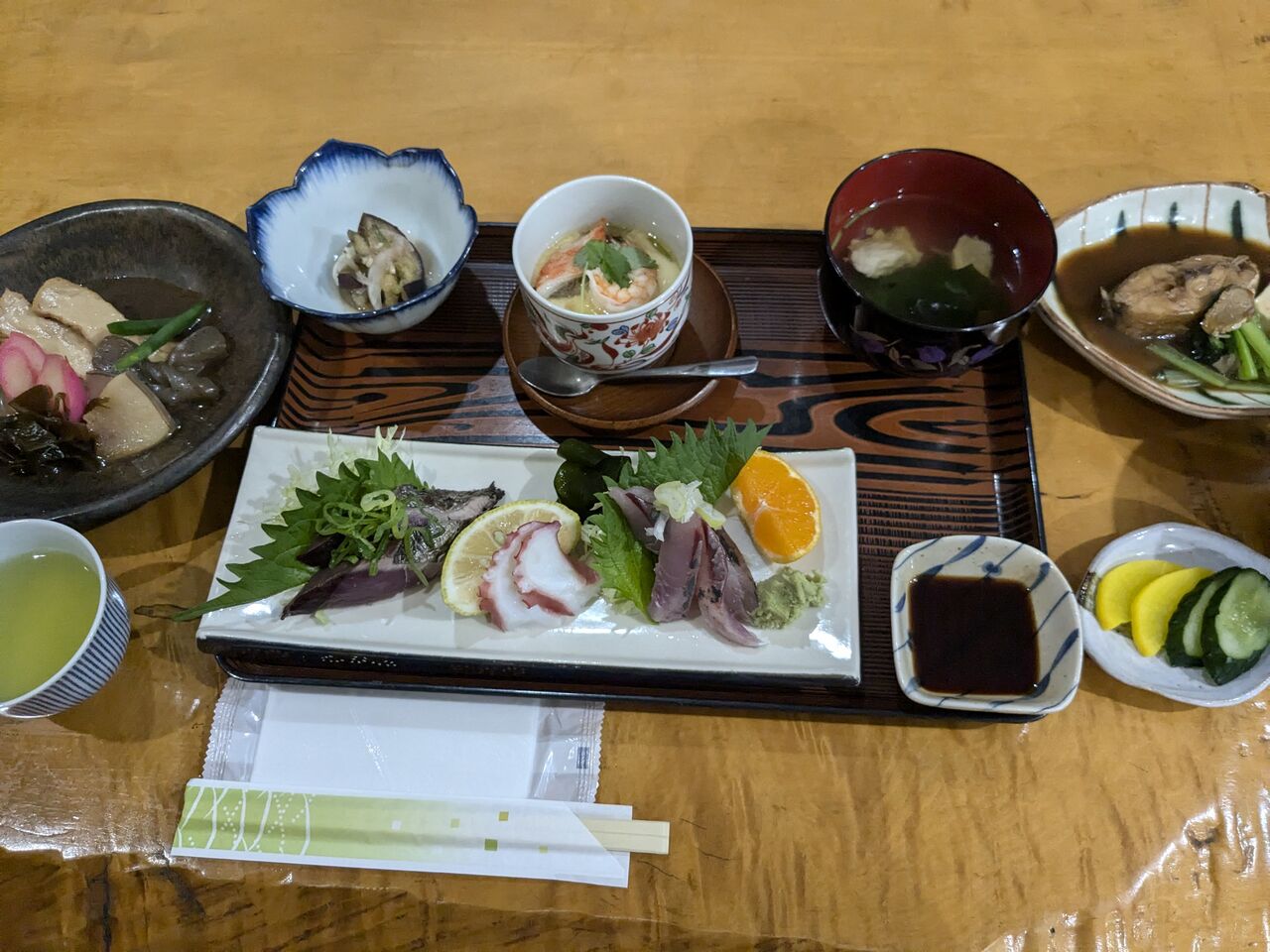 ご馳走だ。刺身(〇〇アジの仲間、鰹、タコ)、〇〇の煮付け(〇〇の仲間)、厚揚げクジラの〇〇などの炊合せ、茶碗蒸し、などなど。