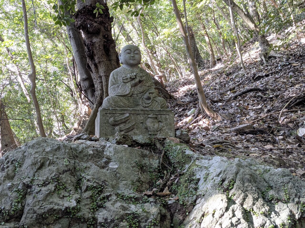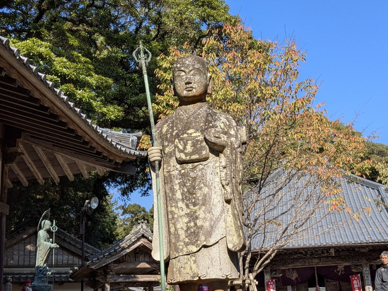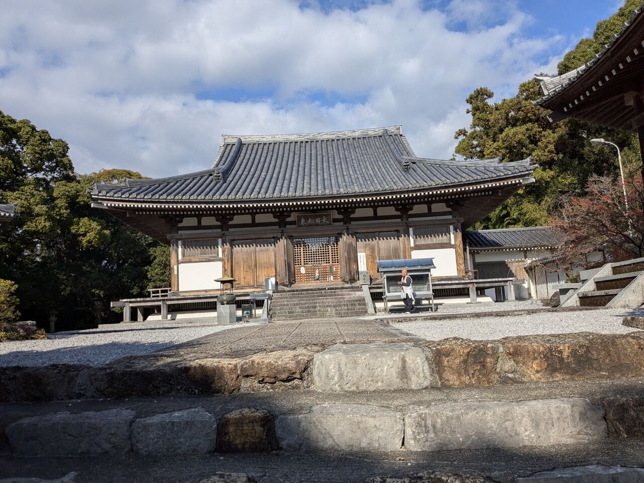 ベンチに荷物を置いて、お参りしようとしていたら、男性のお遍路さん。少し話す、「歩き遍路を2回した。今回は好きな道だけを歩いて、そうでないところは電車やバスに乗る。今回1番から歩き始めて、今2週間くらい。お参りはここまでで、明日は帰る。これから丸亀までJRに乗り、丸亀で一泊して、明日家に帰る。」と。焼山寺までの道をどうするかとか話した。