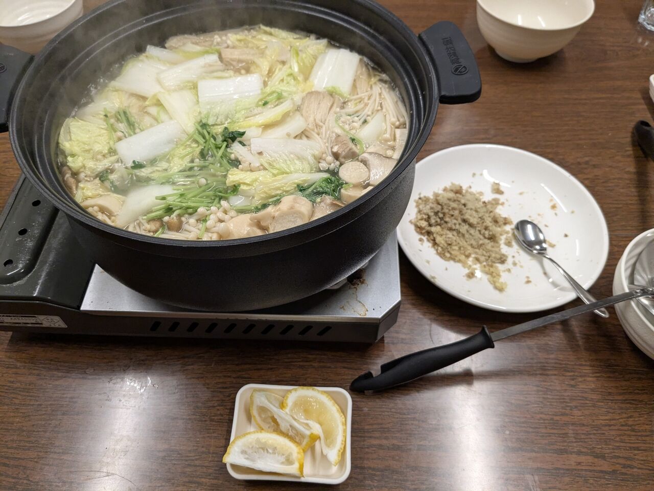 今日はお遍路さんは、私一人ということで、オーナーさんとスタッフさんと3人で鍋を囲む。手羽元と野菜やきのこがたっぷり。生姜と柚子とでいただくが、とても美味しかった。
