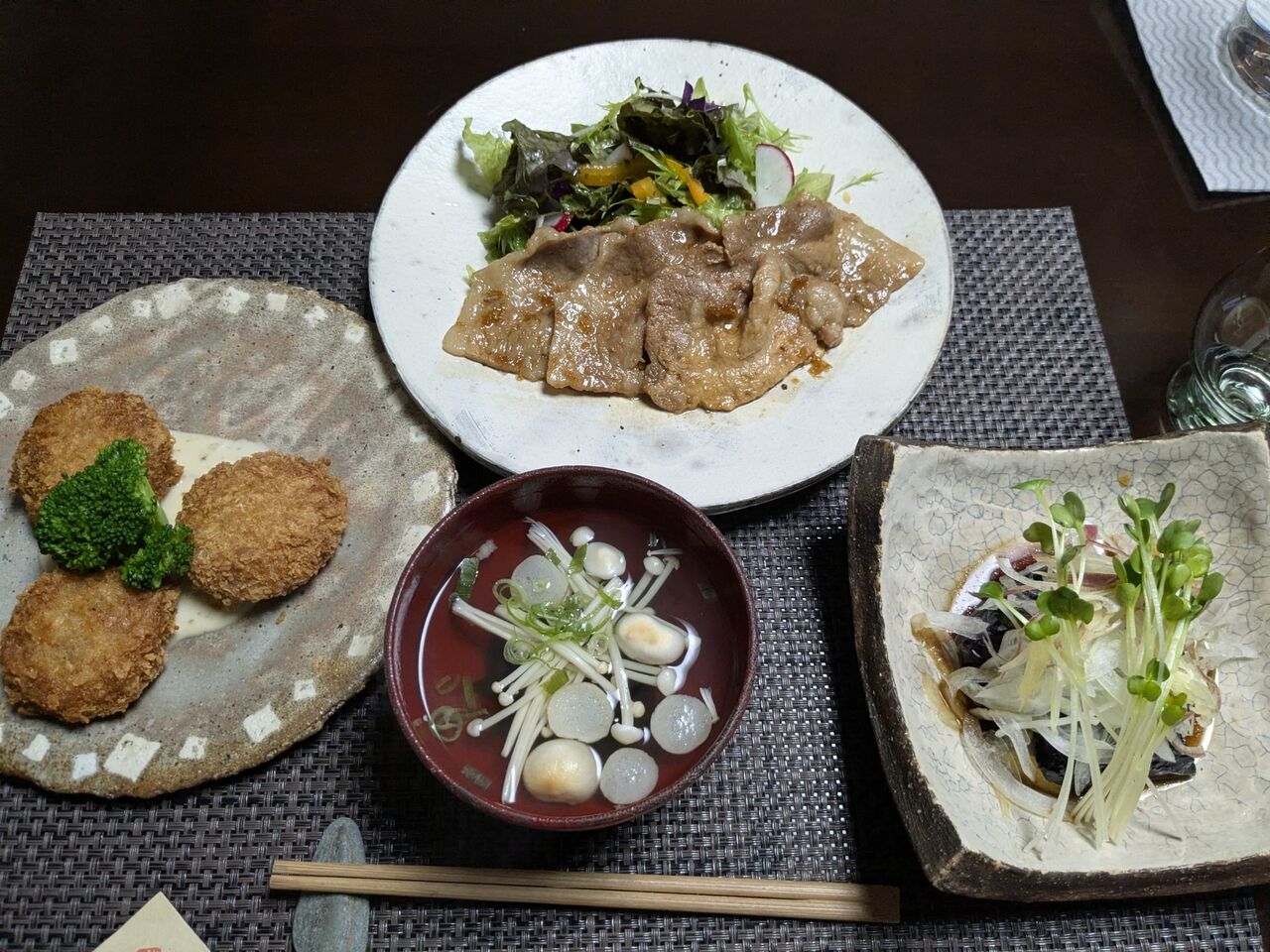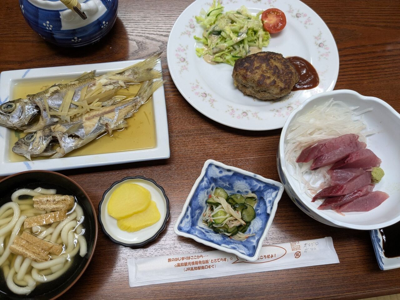 本マグロの子ども(本ヨコ)の刺身、ムツの煮付け、ハンバーグとサラダ、キュウリとカニカマの酢の物、うどんの入った吸い物など。お魚が新鮮で、とても美味しかった。