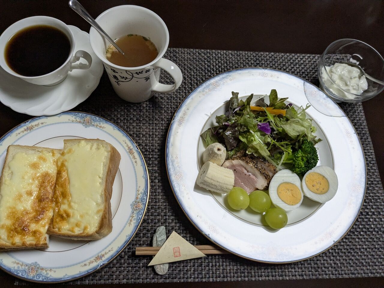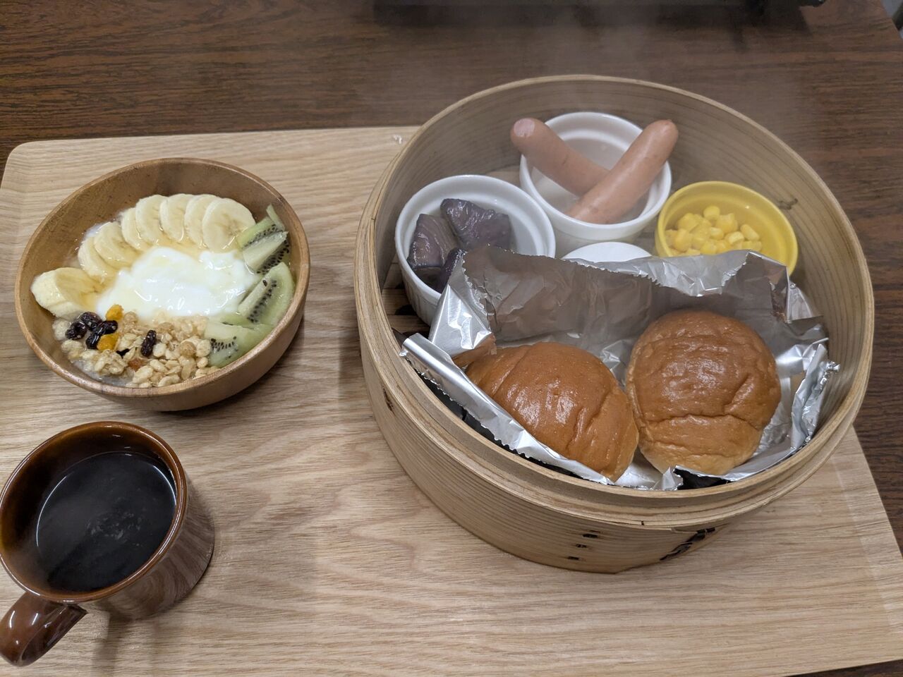 せいろ蒸しで、せいろの中に、ウィンナー、ゆで卵、コーン、なすとパンが入っている。温かくておいしい、それにフルーツとグラノーラの入ったヨーグルトとコーヒー。