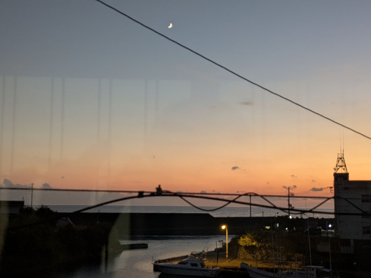 17:25 窓から港が見えて、夕焼けがきれい。三日月も出ている。