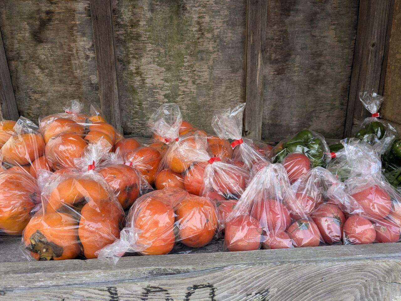 12:02 柿が3個入っていて100円、トマトもミディトマトが4つ入っていて、