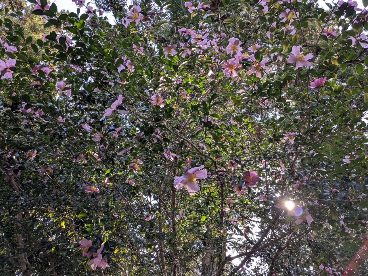 山茶花 一重の薄ピンクの花が可憐できれいだった。