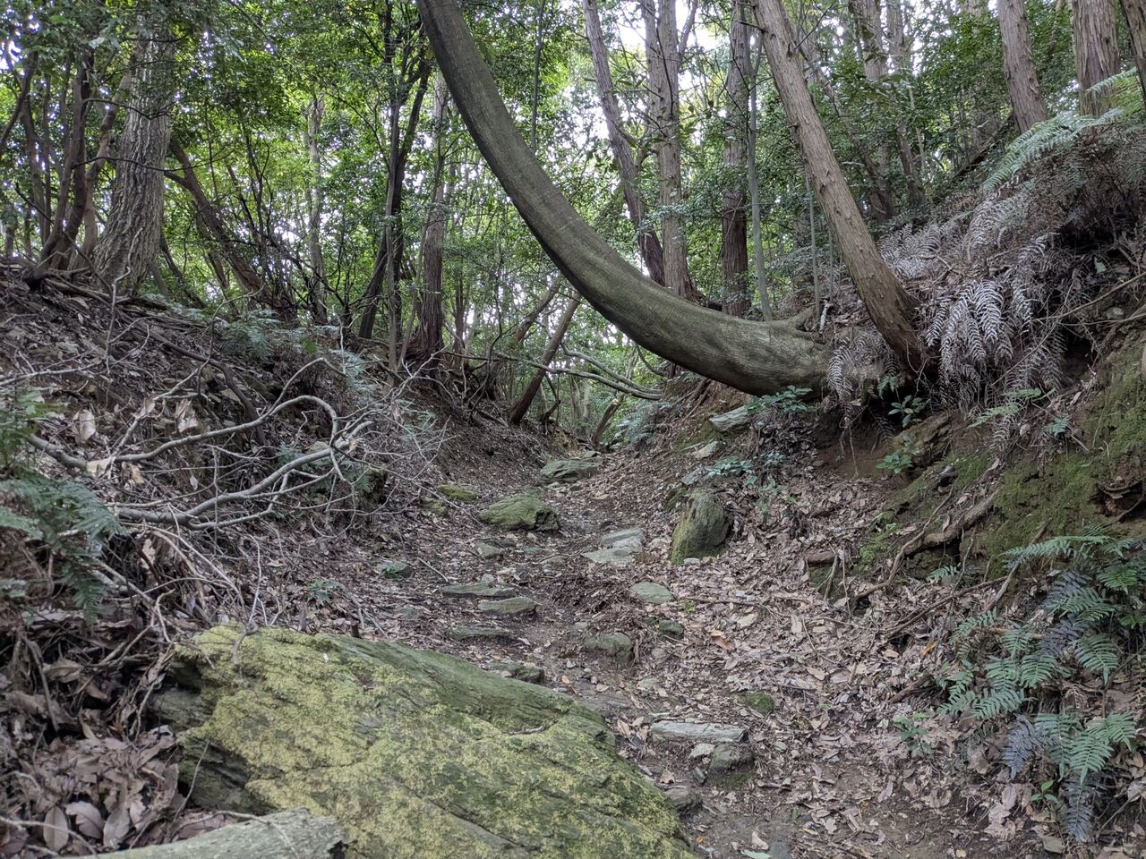 竹の倒木 またげないので、くぐって通ったが、ザックに竹が引っかかった。