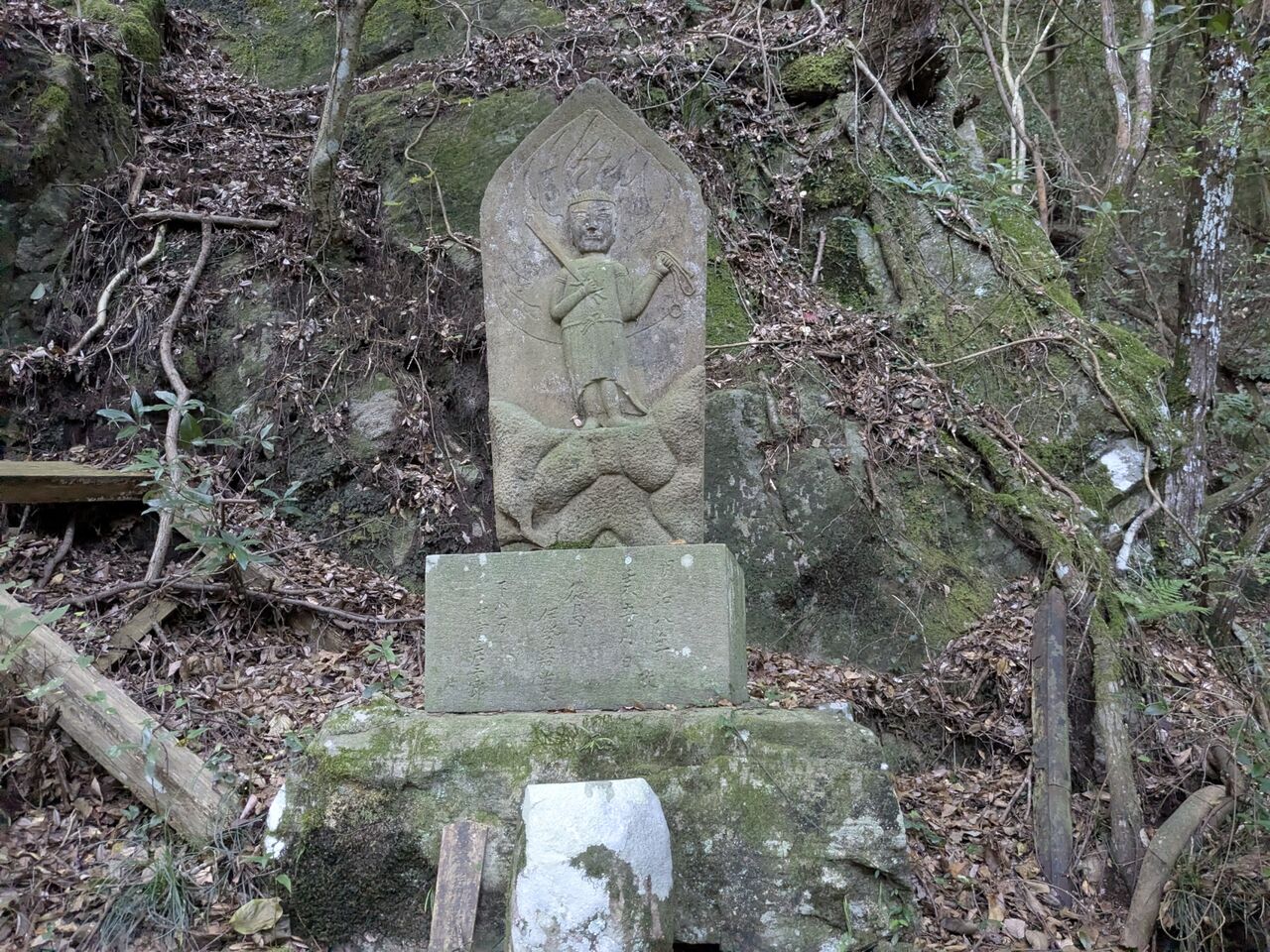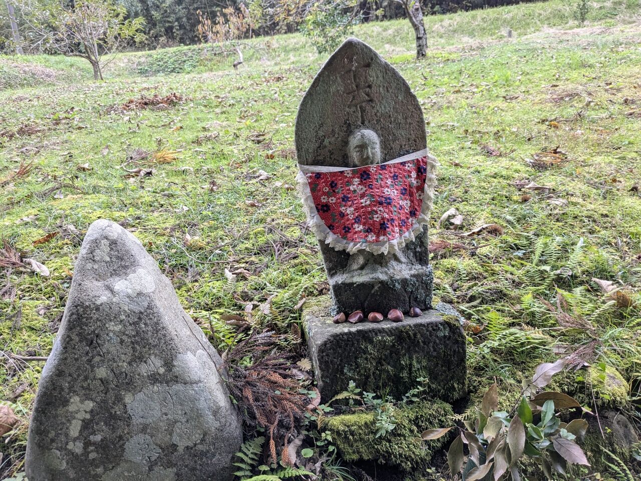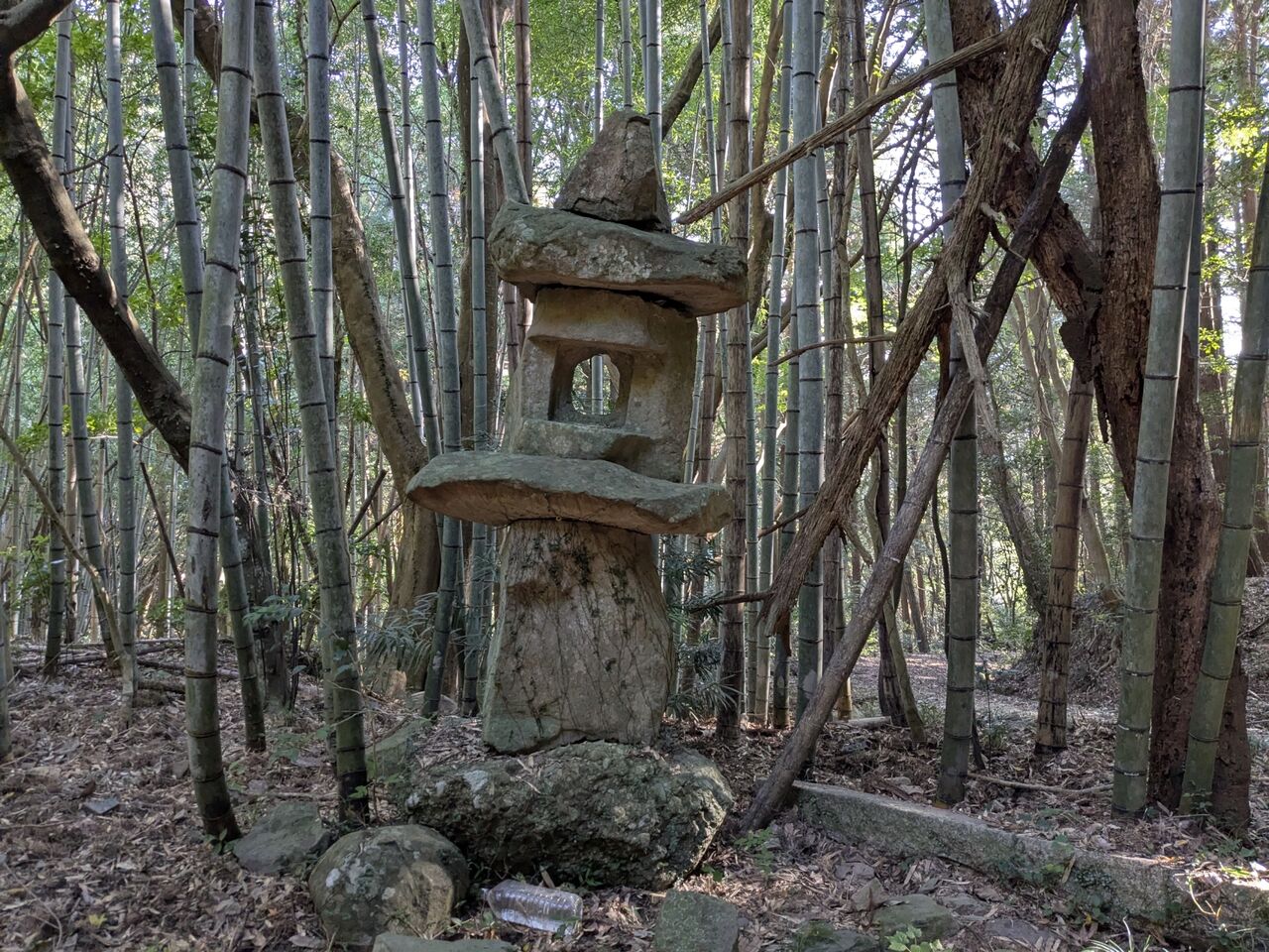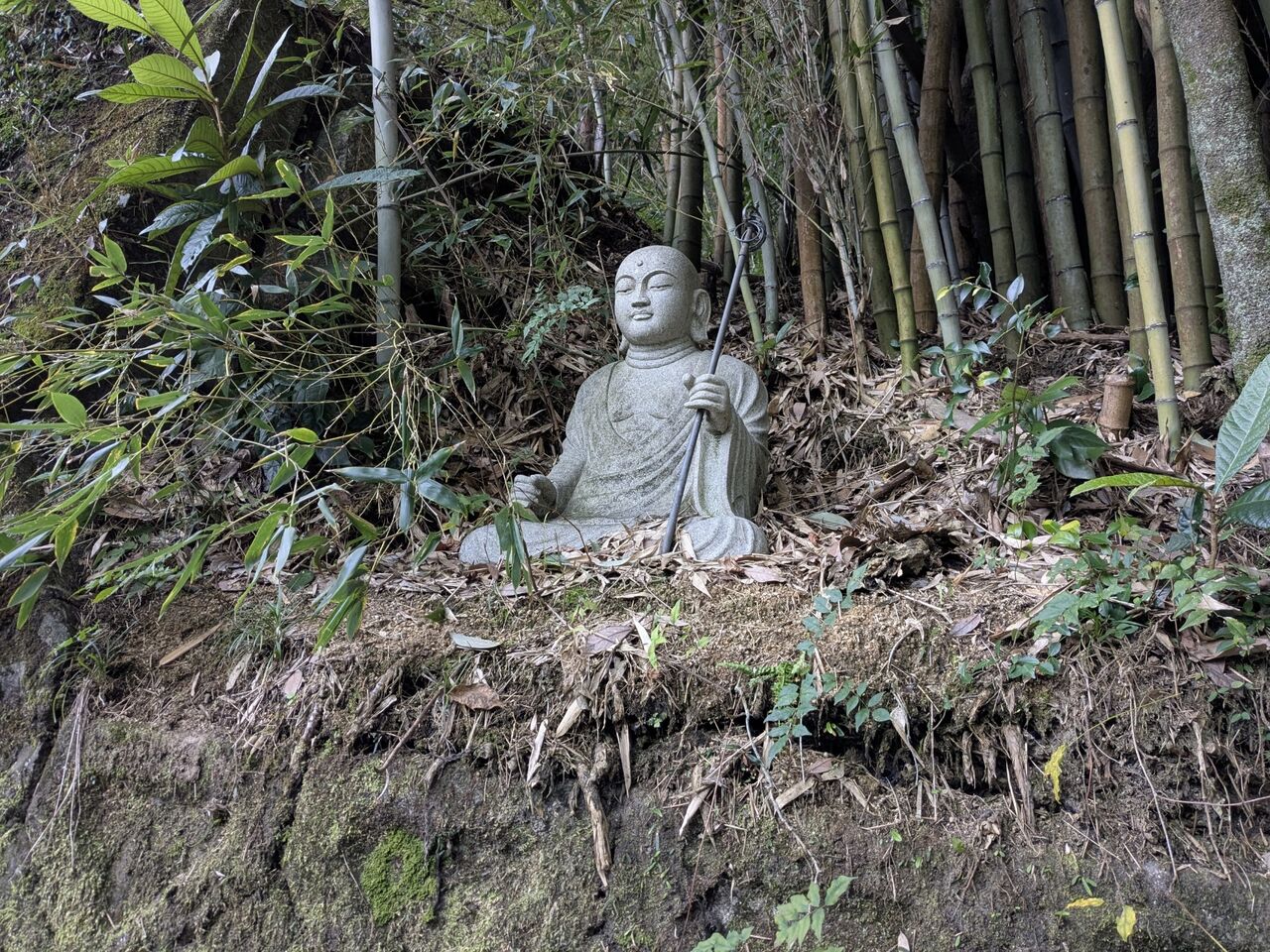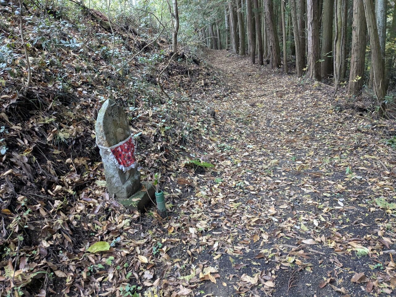 とても旧な擬木の階段、落ち葉がいっぱい積もっていて、滑りそうでとても怖い。石の手すりをもってソロリソロリ下りる。