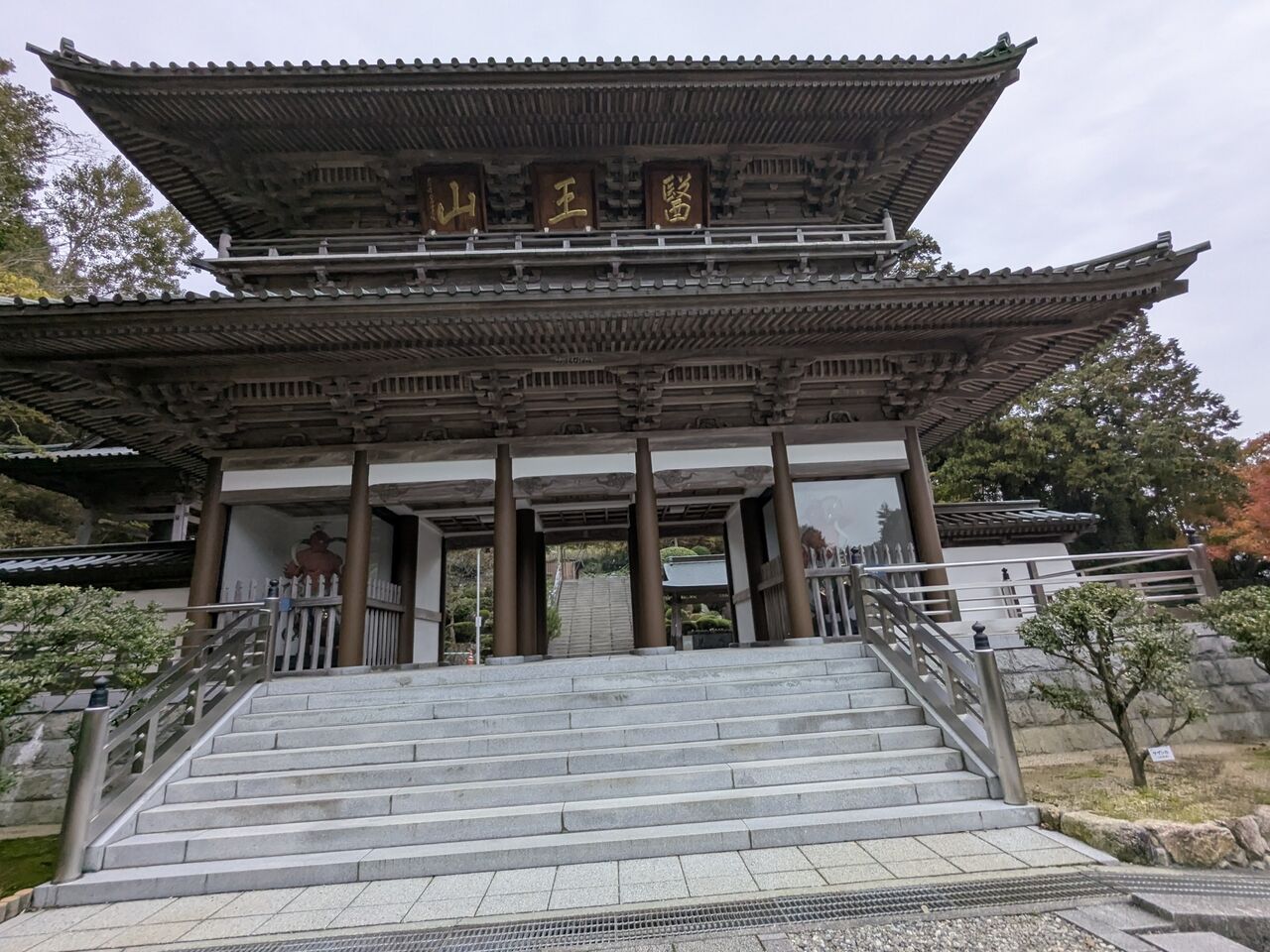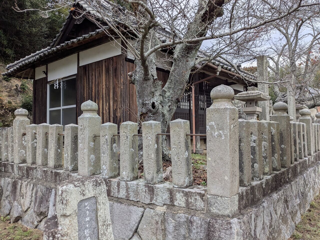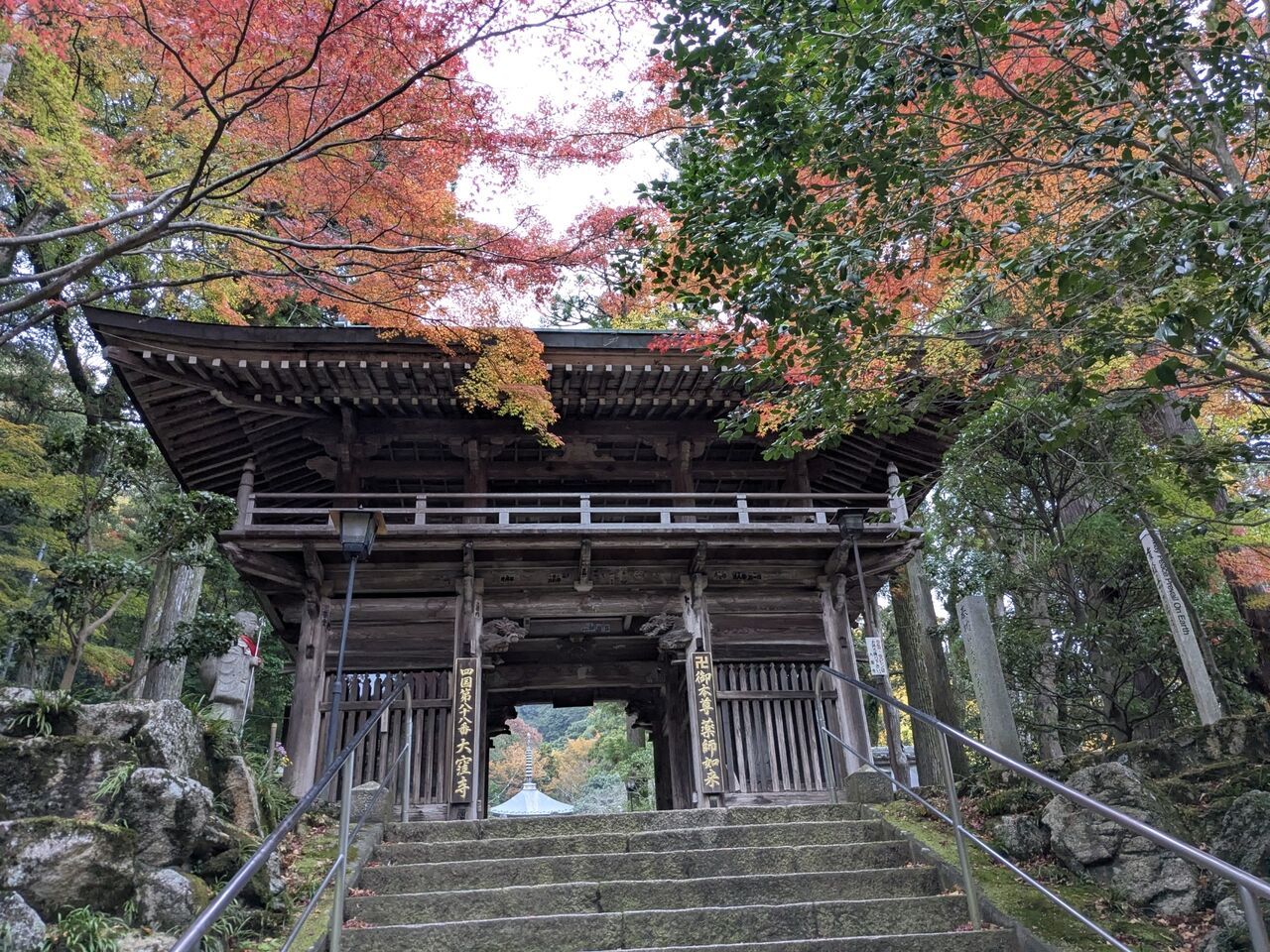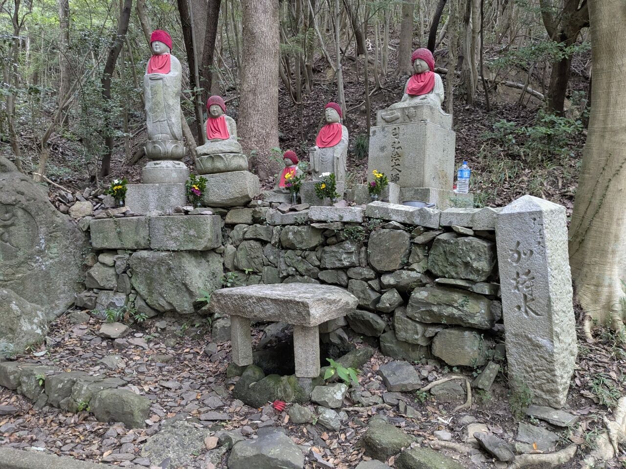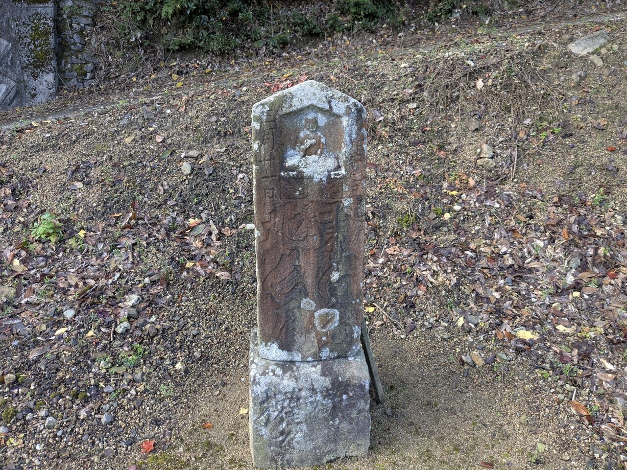 とても旧な擬木の階段、落ち葉がいっぱい積もっていて、滑りそうでとても怖い。石の手すりをもってソロリソロリ下りる。