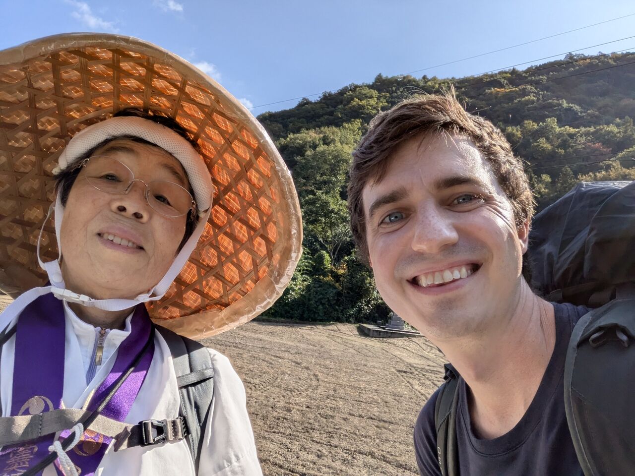 12:32 向こうから、またもや外国人の男性。笈摺を着たお遍路さんだ。杖をついて、たどたどしい歩き方をされている。