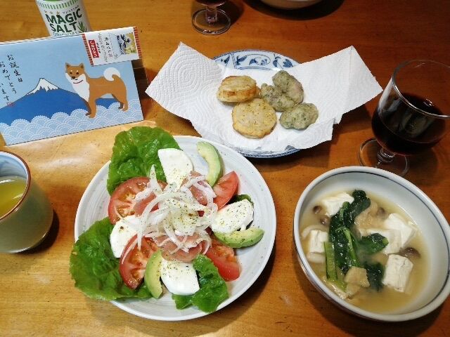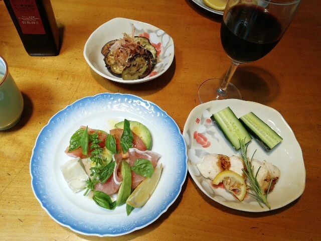 今日の夕ご飯はあいちゃんの好きだったもの。アボカド、生ハム、トマト、チーズのカプレーゼふう。バジルは庭からとってきたよ。むね肉は塩麹とレモンとローズマリーで焼いたもの。あいちゃんはローズマリーが好きだったね。バジルもローズマリーもあいちゃんは自分で買ってきて庭に植えていたね。そしてミニ菜園からとってきたきゅうりを添えた。きゅうりは3本目だよ。ワインで乾杯!